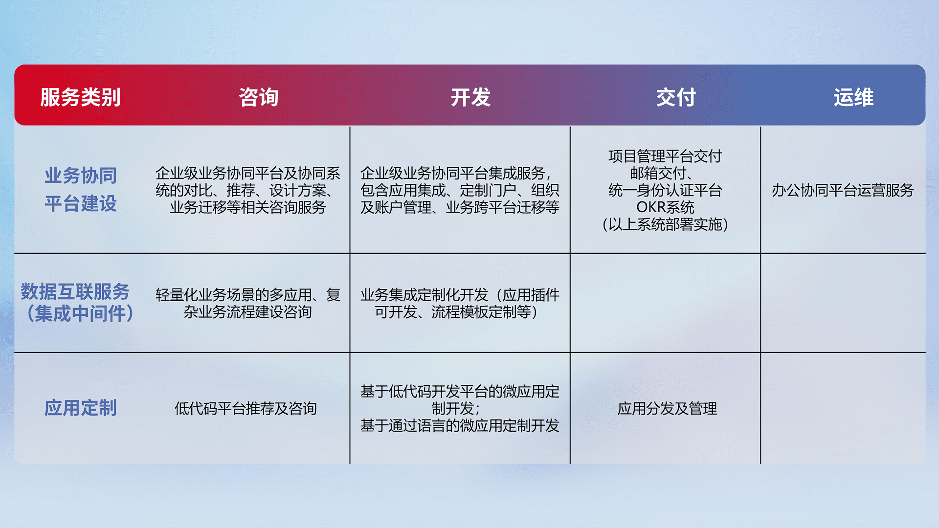 针对钉钉、、、企微、、、IDaas等平台级产品提供产品的规划、、、方案、、、、交付、、定制化开发等服务,,,实现如统一协同办公、、、、智能客户服务、、、混合会议管理、、、、智能数据查询、、、等业务场景,,,,实现数字化转型。。