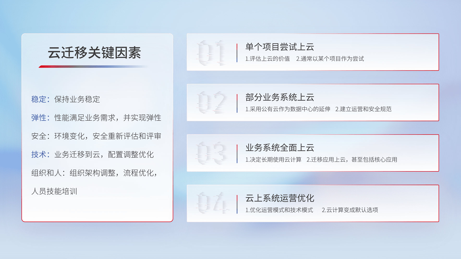 结合实际业务,,从规划设计、、云平台选型、、、云原生改造、、、数据迁移、、、、集成交付,,,,迁移全过程为客户识别最佳上云路径,,做好风险识别管理,,,,设计网络架构、、身份权限、、安全审计合规、、、、操作审计、、、日志审计、、监控告警策略、、、、多站点容灾设计等,,,,对云上基础设施进行整体规划,,提升IT治理水平,,,,以满足弹性、、高可用、、高性能的需求。。。